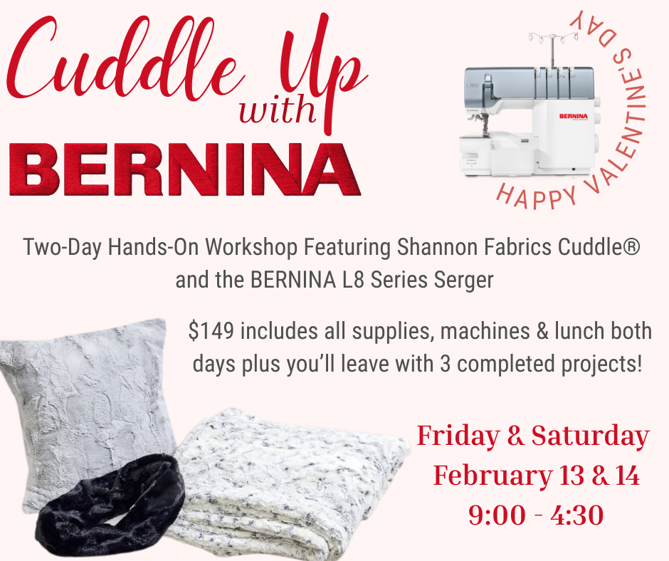 Enjoy a hands-on, in-store workshop experience featuring BERNINA’s top L8 series sergers and Shannon Fabrics’ irresistibly soft Cuddle® minky fabric. Lead by Cuddle Ambassador Laura Severson.
